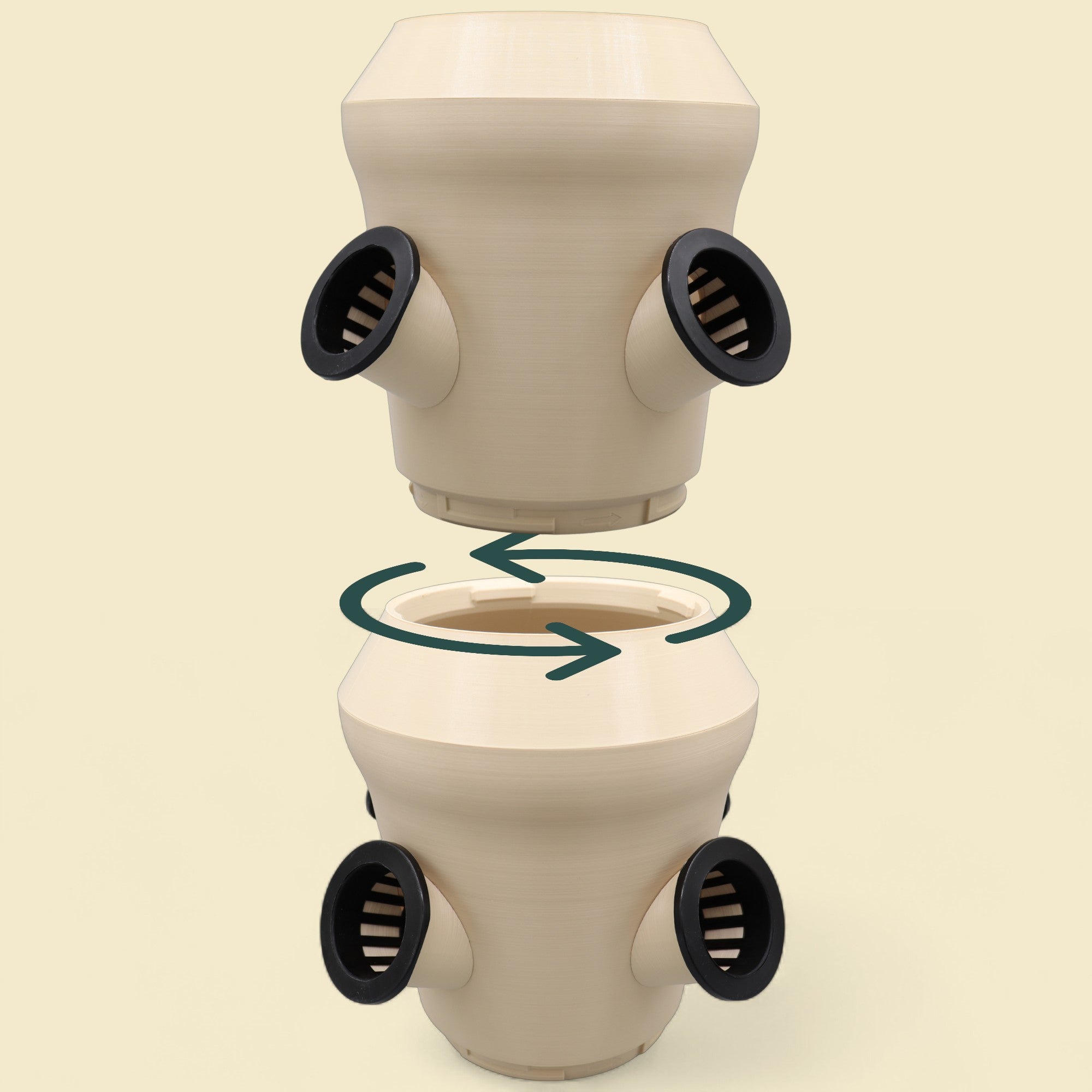 Each module adds 4 more grow slots to your tower. Simply twist, stack, and feed the tubing through the center. Designed to lock perfectly with your current system.